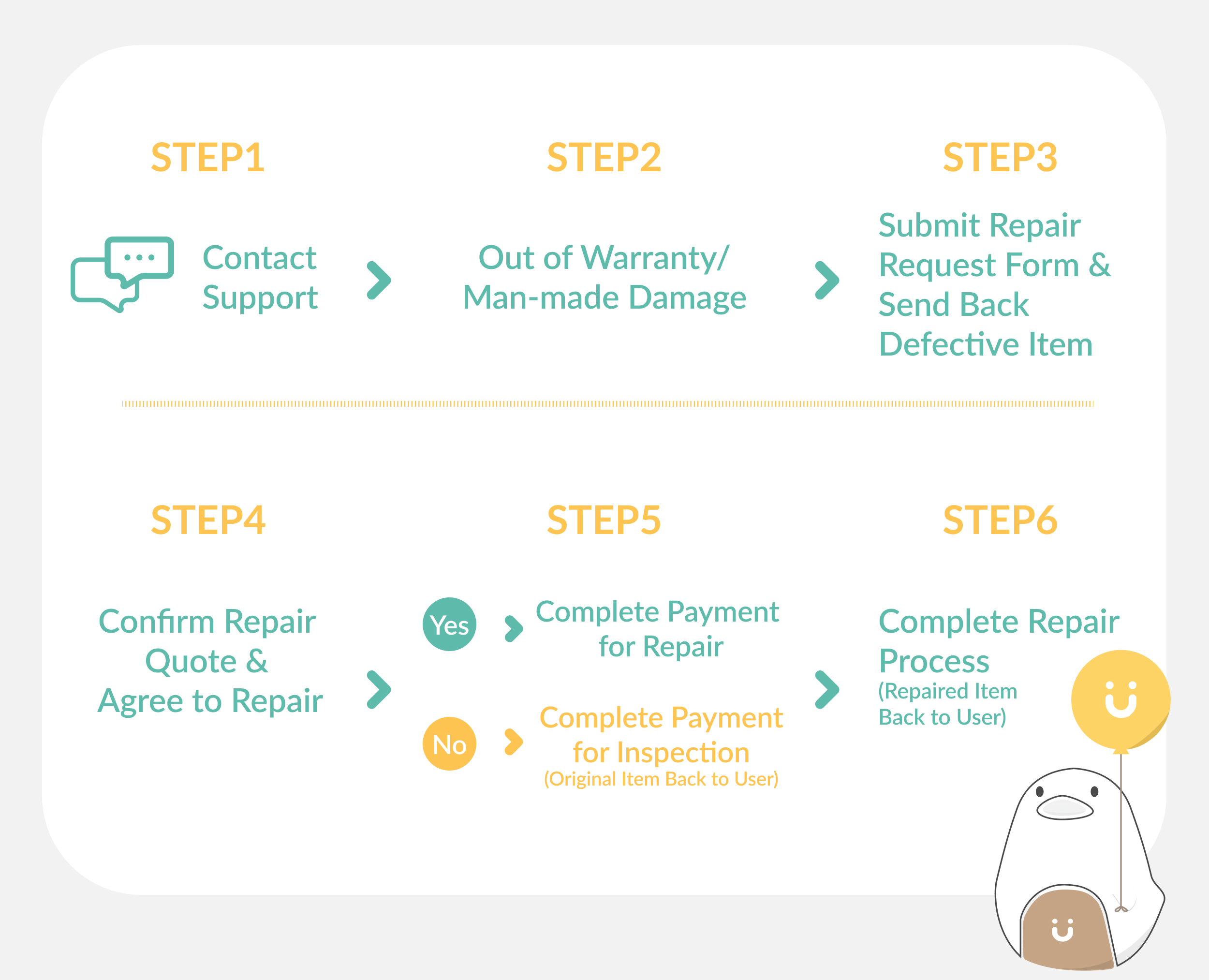 - Потребителят трябва да изпрати дефектния продукт на определеното място на свой разход след като се свърже с нашия екип за обслужване на клиенти и подаде формуляр за заявка за ремонт. Ние ще завършим процеса на ремонт в нашия Ремонтен център в Тайван.