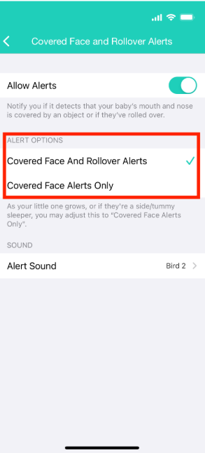 - С нарастването на бебето, ако родителите вече не желаят да получават известия за "обръщане или спане по корем", но все пак искат да получават известия за "покритие на устата и носа, докато спят по гръб/страни", те могат да активират опцията "Само известия за покрито лице".