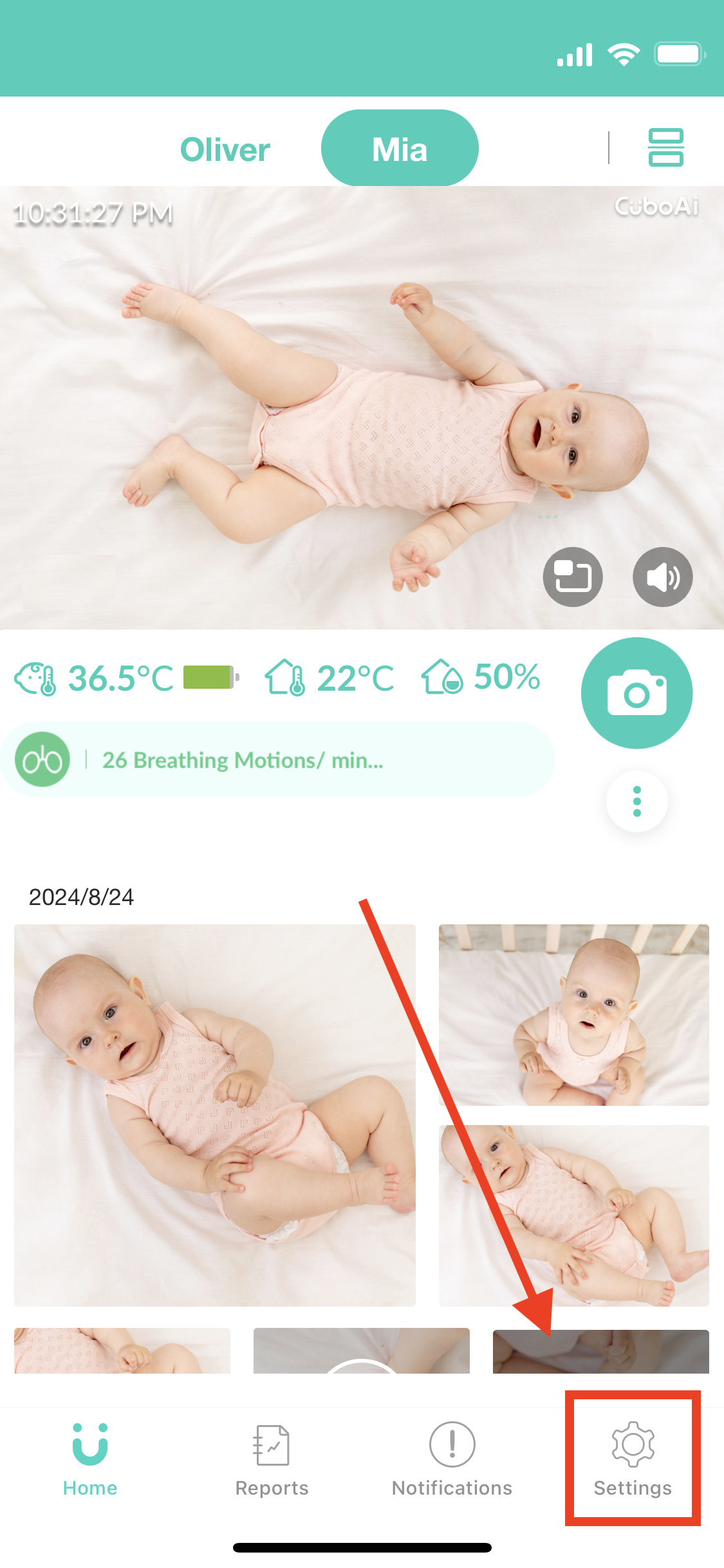 Todas las alertas de temperatura y humedad de los últimos 7 días se pueden encontrar en la pestaña de Notificaciones junto con todas las demás alertas (Cara cubierta, Detección de llanto, Entrada en zona de peligro, etc.)