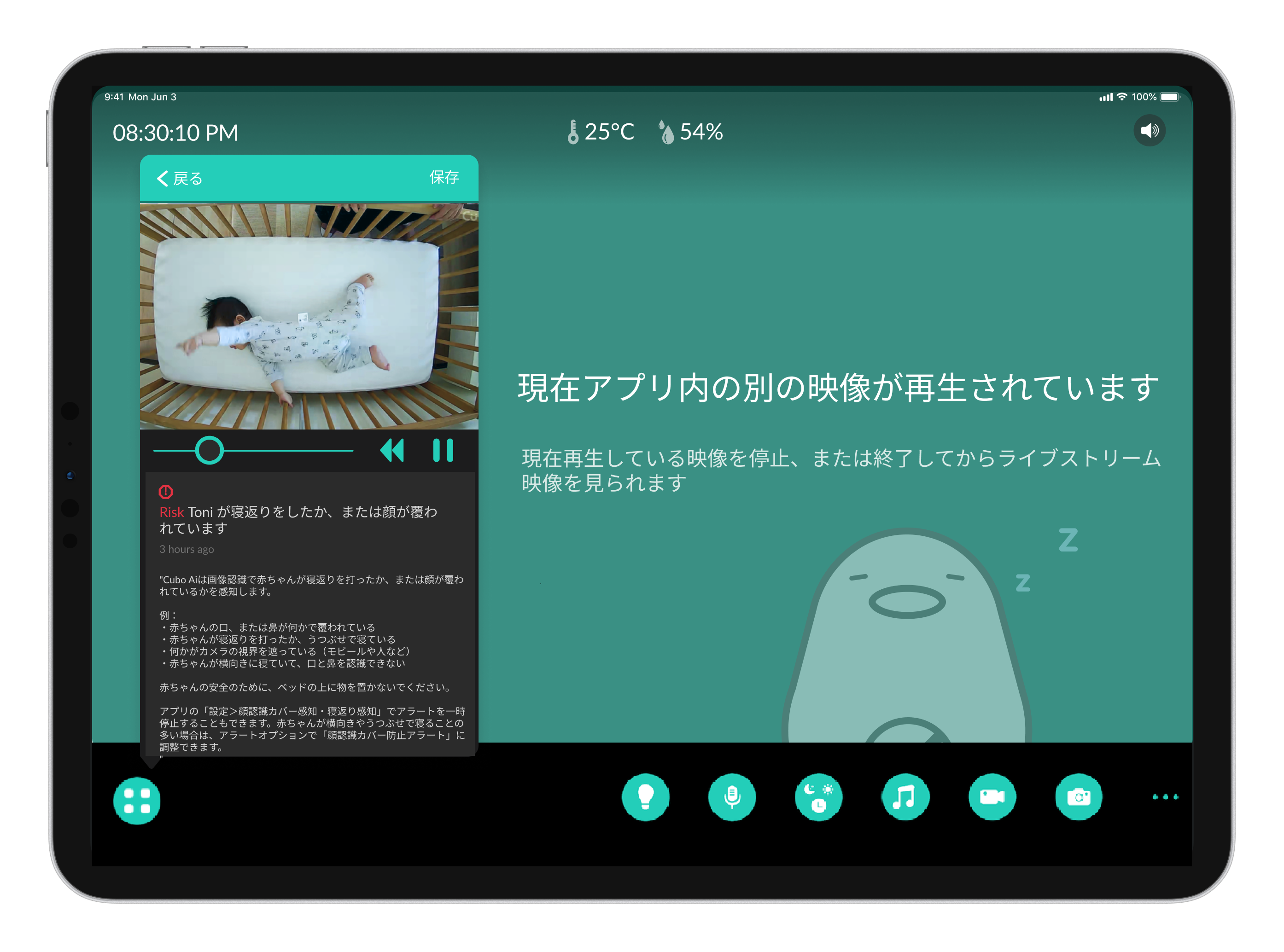 iPad版では、ホーム画面にナイトライトと録画のボタンがあります。また、フルスクリーンモードでLIVE映像をご覧いただけます(画面比率23:16の機種のみ。4:3の機種は画面を水平に少しスライドさせていただくとフルスクリーンで表示されます)。このほか温度・湿度、LIVE映像の時間、消音ボタン、過去18時間の録画再生+出来事タグ、複数のベビーモニターの切り替えタグなどが表示されます。