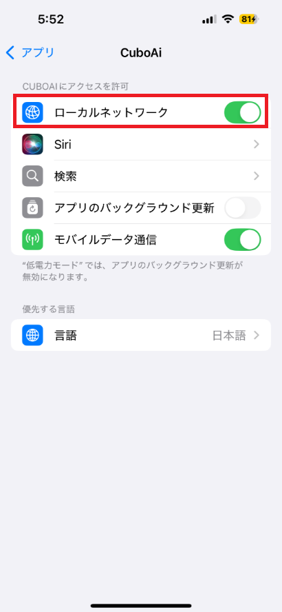 端末自体の設定画面 → "アプリ" → "CuboAi"→ "ローカルネットワーク"がオンになっていることを確認してください。