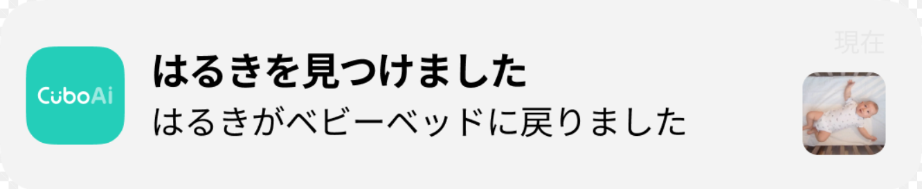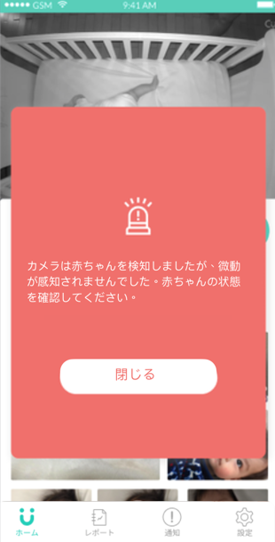 「赤ちゃんが見つかりません」通知の送信し、LIVE画面の下側にベビーセンサーパッドの検知ステータスに「大きな動きを感知しました」または「xx回の微動/分」を表示します。