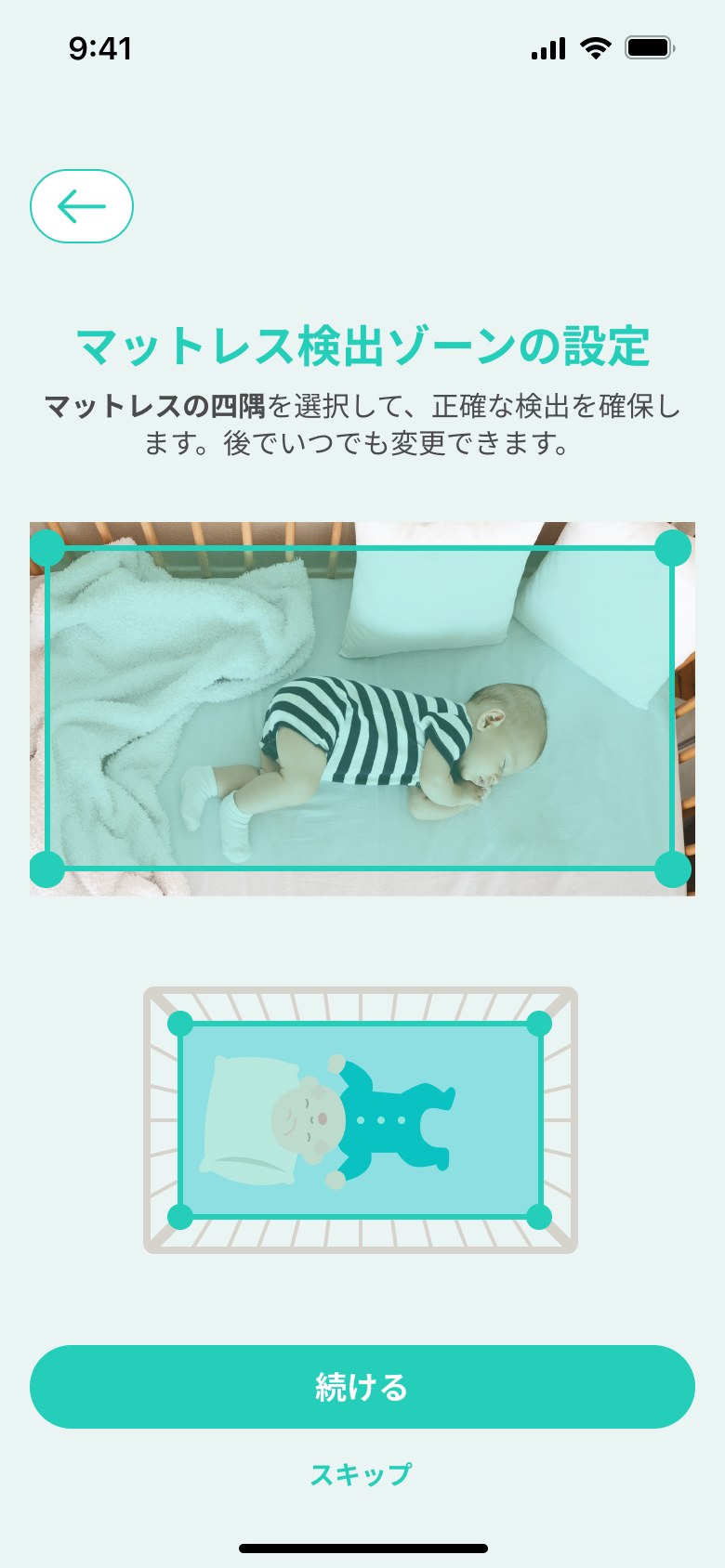 ⑤「モニターの位置調整(ベビーモニター本体の移動や角度の変更をする必要がある)」を行い、「マットレス検出ゾーン」や「マットレスの長さ」を設定する。