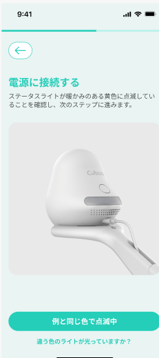 ステータスライトがオレンジ色の点灯から点滅に変わると、Wi-Fi設定ができます(オレンジ色の点滅に変わらない場合は、以下をご参照ください:CuboAi 第3世代接続時のステータスライトが正常でない場合。