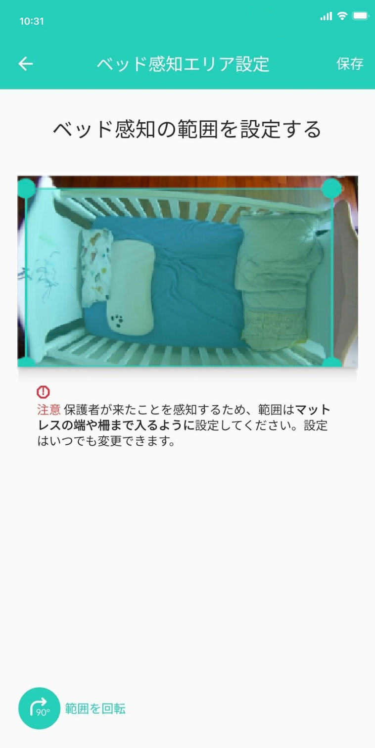 (ご注意:感知エリアを設定する際、ベビーベッド全体が入るようにしてください。