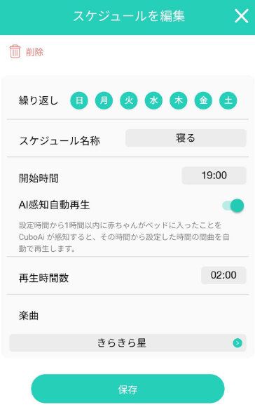 💡「AI子守唄スケジュール」機能は、CuboAi Care プレミアムサービス もしくは CuboAi Care アルティメットサービスに加入したお客さまのみご利用いただけます。