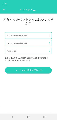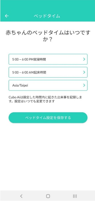 ④お子さまの正確な就寝時間と起床時間、タイムゾーンを調整し、設定してください。