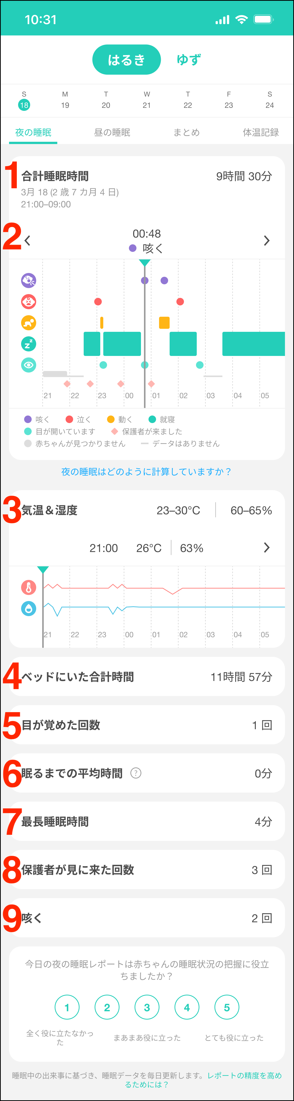 ( 赤ちゃんがベッドで感知された時間のことを指します。保護者は、この情報と赤ちゃんの実際の睡眠時間を確認して、睡眠パターンを分析することができます ) - 目が覚めた回数