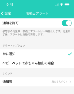 ※ベビーモニターのファームウェアバージョンが463-2.0.2199であり、CuboAiアプリのバージョンがiOS V.2.14.4またはAndroid V2.14.3以上の場合、咳検出アラートの設定で「常に通知」と「ベビーベッドで赤ちゃん検出の場合」を選択することでができます。