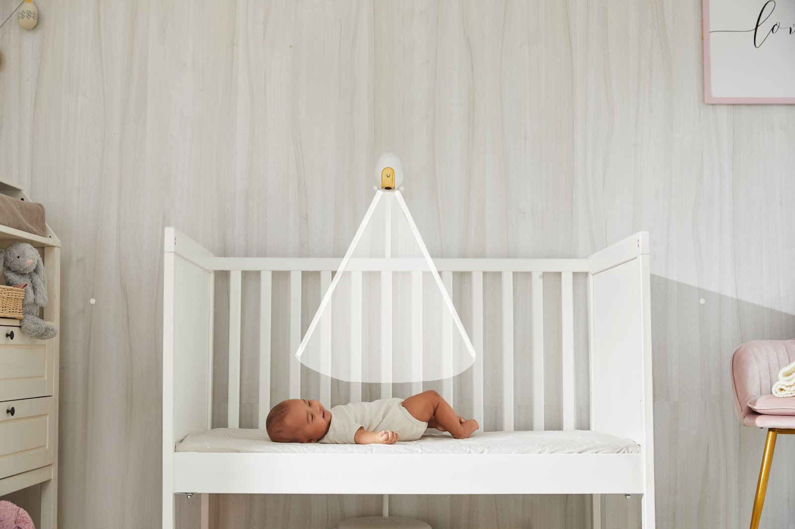 Użyj z Stojakiem U, postaw obok łóżeczka dziecka: przechyl obiektyw w dół, aby zobaczyć dziecko z góry