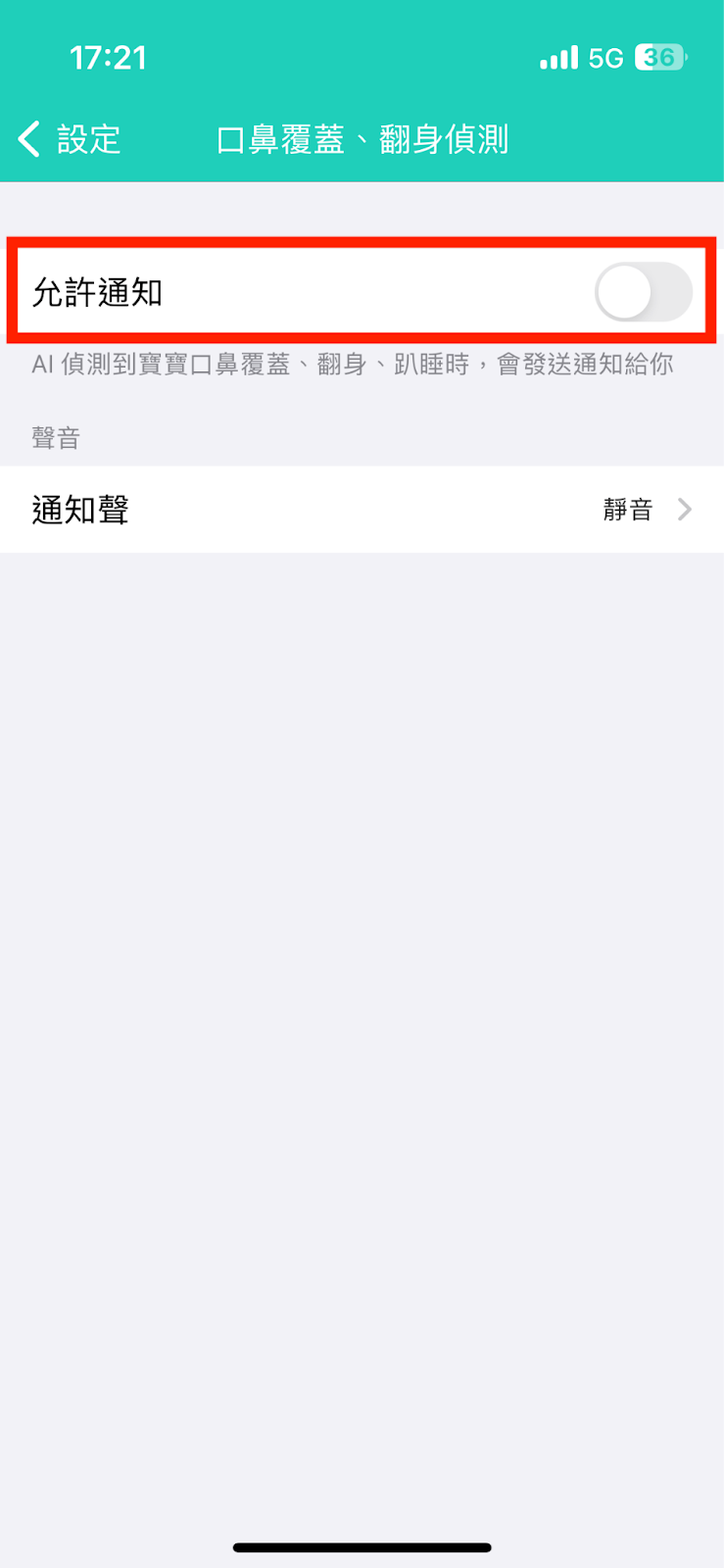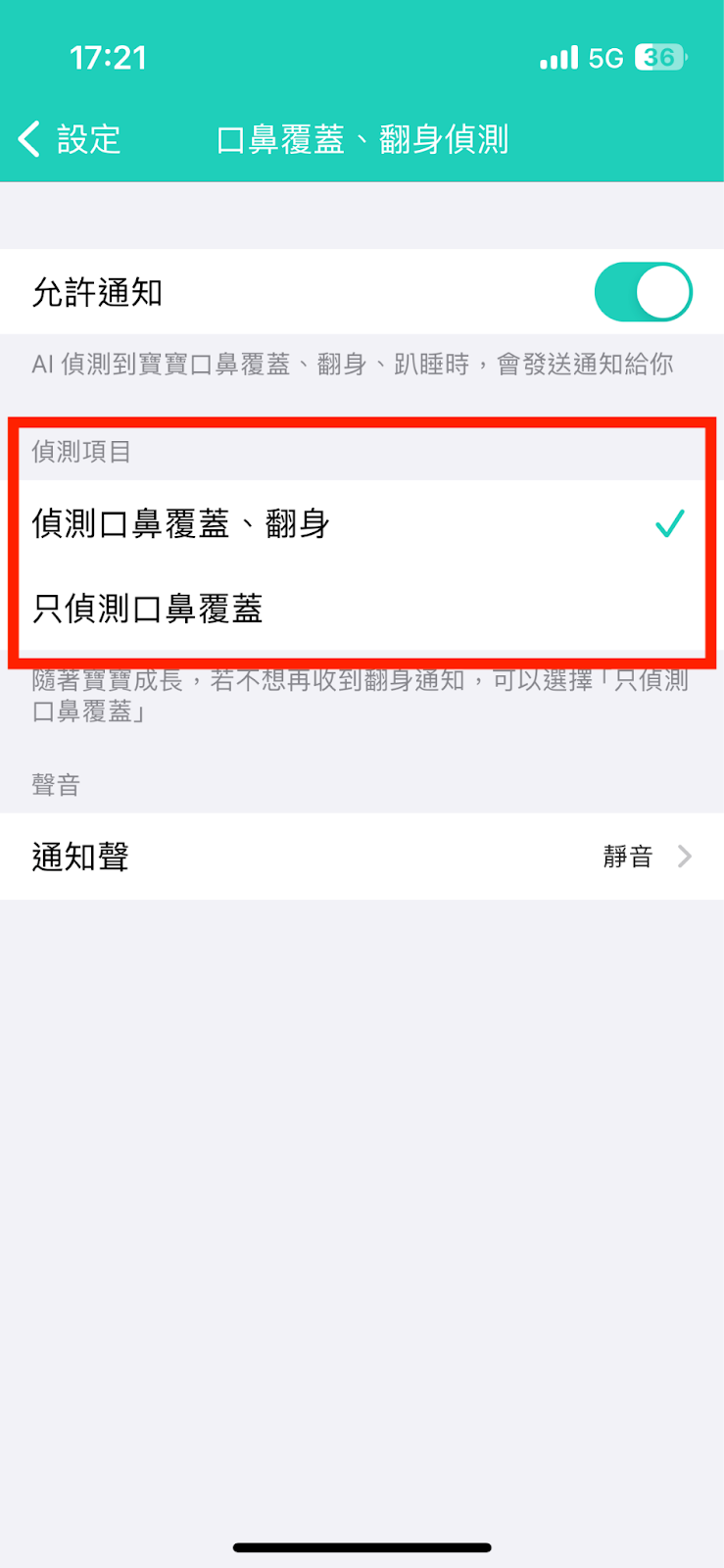 步驟4:點選允許通知並選擇「偵測口鼻覆蓋、翻身」或是「只偵測口鼻覆蓋」