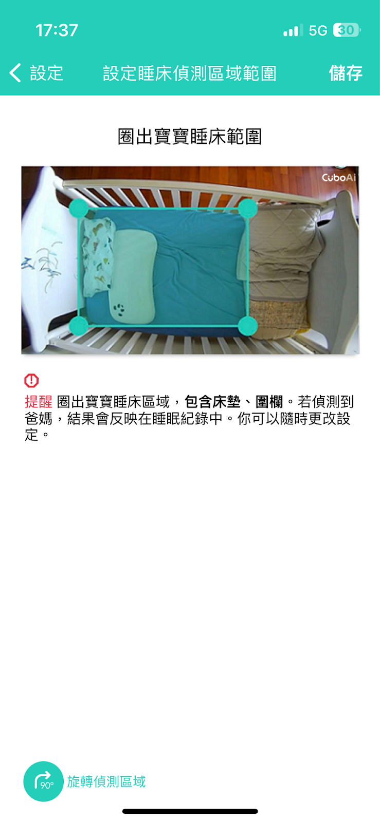 將 CuboAi 架設完成後,若發現鏡頭涵蓋的範圍較大,爸媽可以藉由設定偵測區域範圍,讓 CuboAi 的 AI 針對選定的範圍來進行偵測、確保寶寶的安全,同時也能避免爸媽走進寶寶床邊時的動作、床外的其他物品,影響 AI 偵測的準確度!