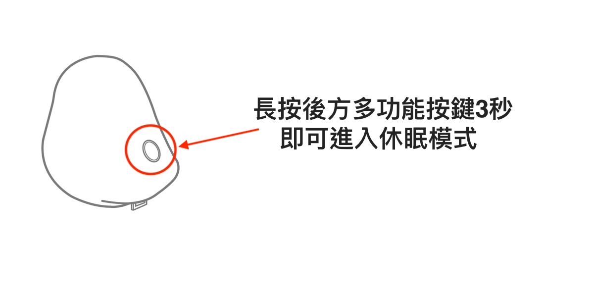 要讓 CuboAi Plus 進入休眠模式,不論使用哪種支架,都只需要長按多功能按鈕約 3 秒鐘,聽到休眠模式提示音且燈號轉變為緩慢閃爍的綠燈時,即進入休眠模式;再按一次按鈕就可以關閉休眠狀態。