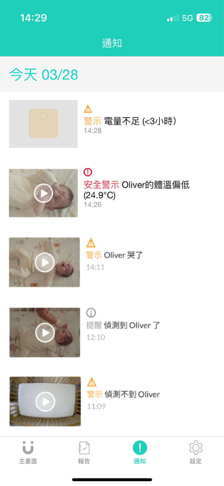 以上通知皆會保存在通知牆上 7 天,其中高低溫通知,18 小時內會有 20 秒短片讓爸媽回顧確認,低電量通知和斷線通知則不會有任何影片或縮圖