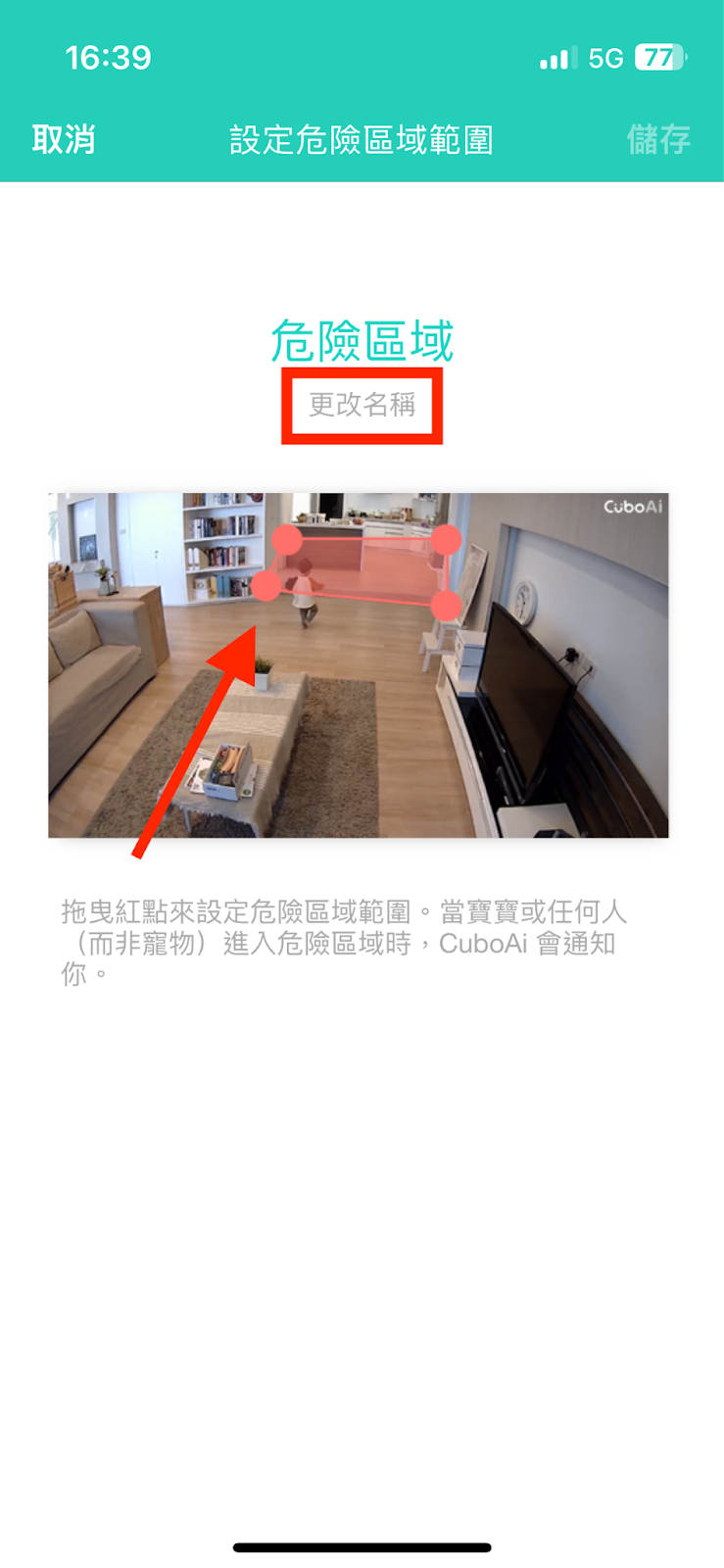 步驟5:進入設定頁後,畫面會 4 個頂點的紅框,爸媽可以拖曳頂點來自訂危險區域範圍,並重新命名危險區域名稱