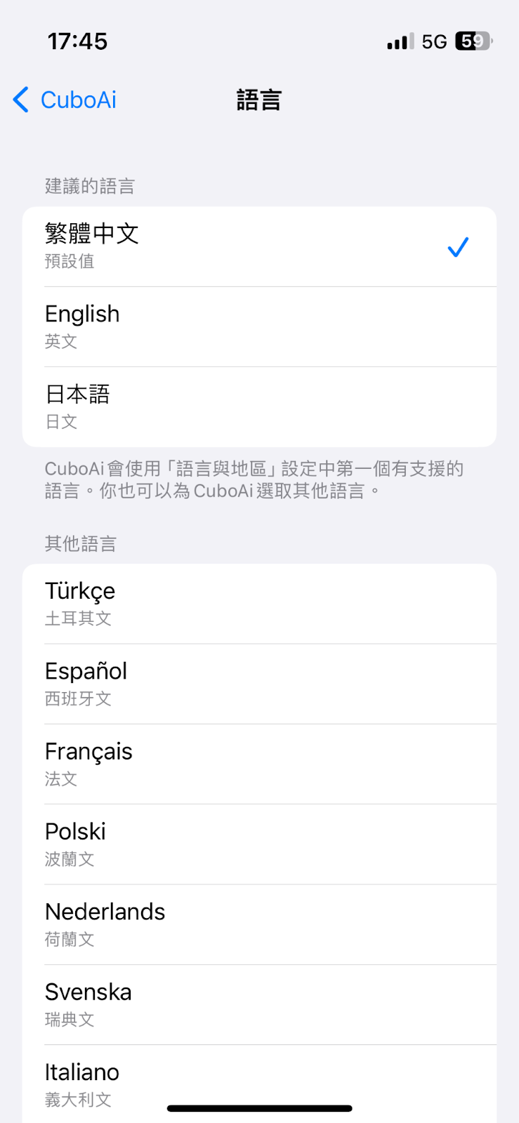 CuboAi App 有支援英文、繁體中文、日文、法文、德文、西班牙文...等多種語言,並會隨著手機的系統設定自動變更!