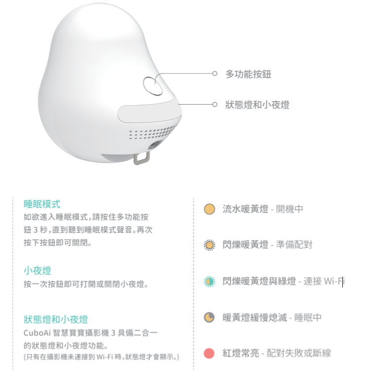 CuboAi 的燈號會依照攝影機的狀態變化,並顯示於多功能按鈕上