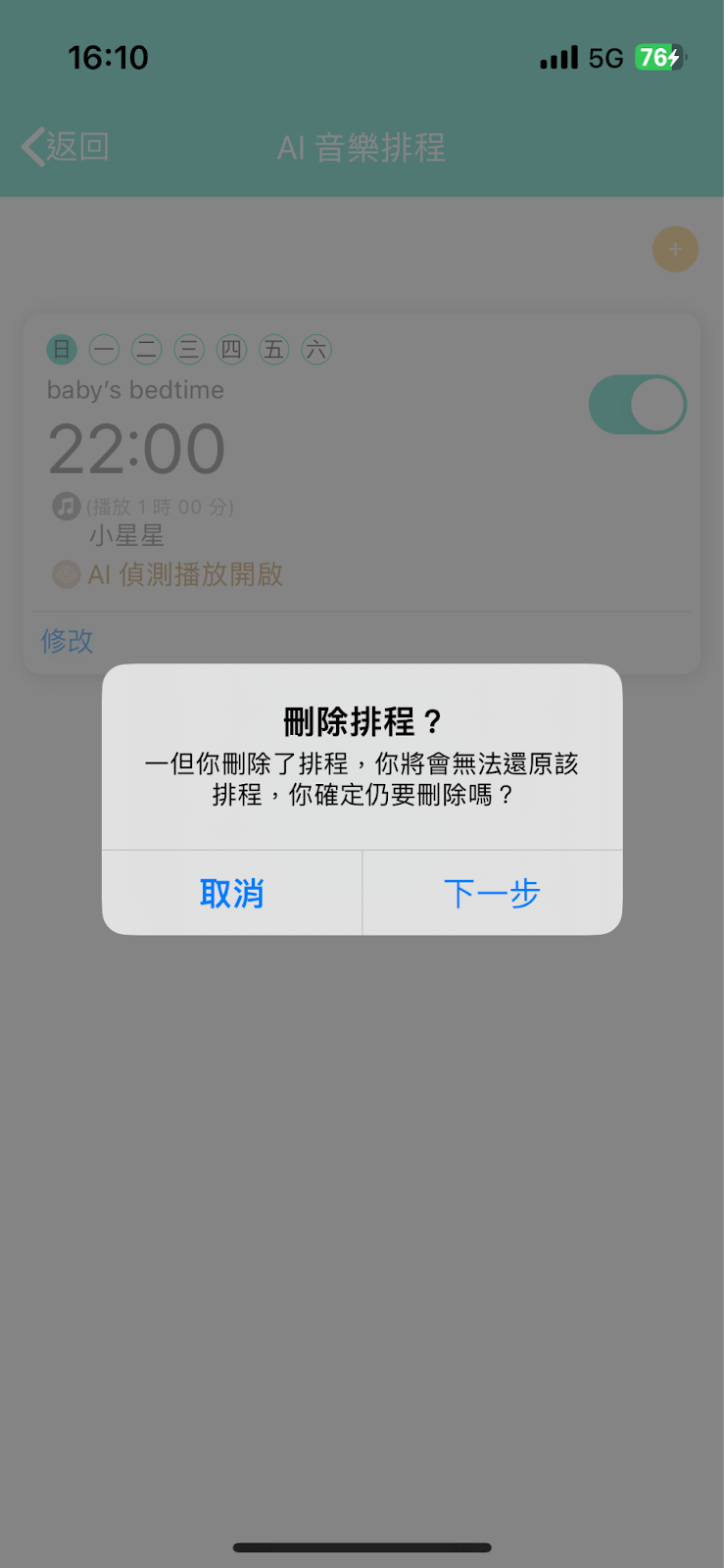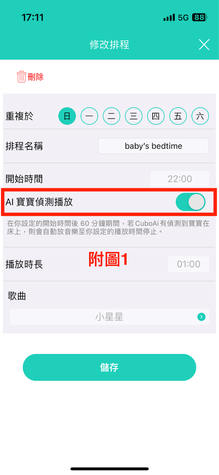 2.有開啟「AI 寶寶偵測播放」,但寶寶於排程時間不在床上(附圖1)